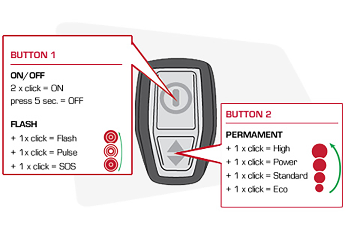 В комплекте: аккумулятор, удлинительный кабель, зарядка, крепление на руль, универсальное крепление, адаптер для Action-камеры, модуль дистанционного управления