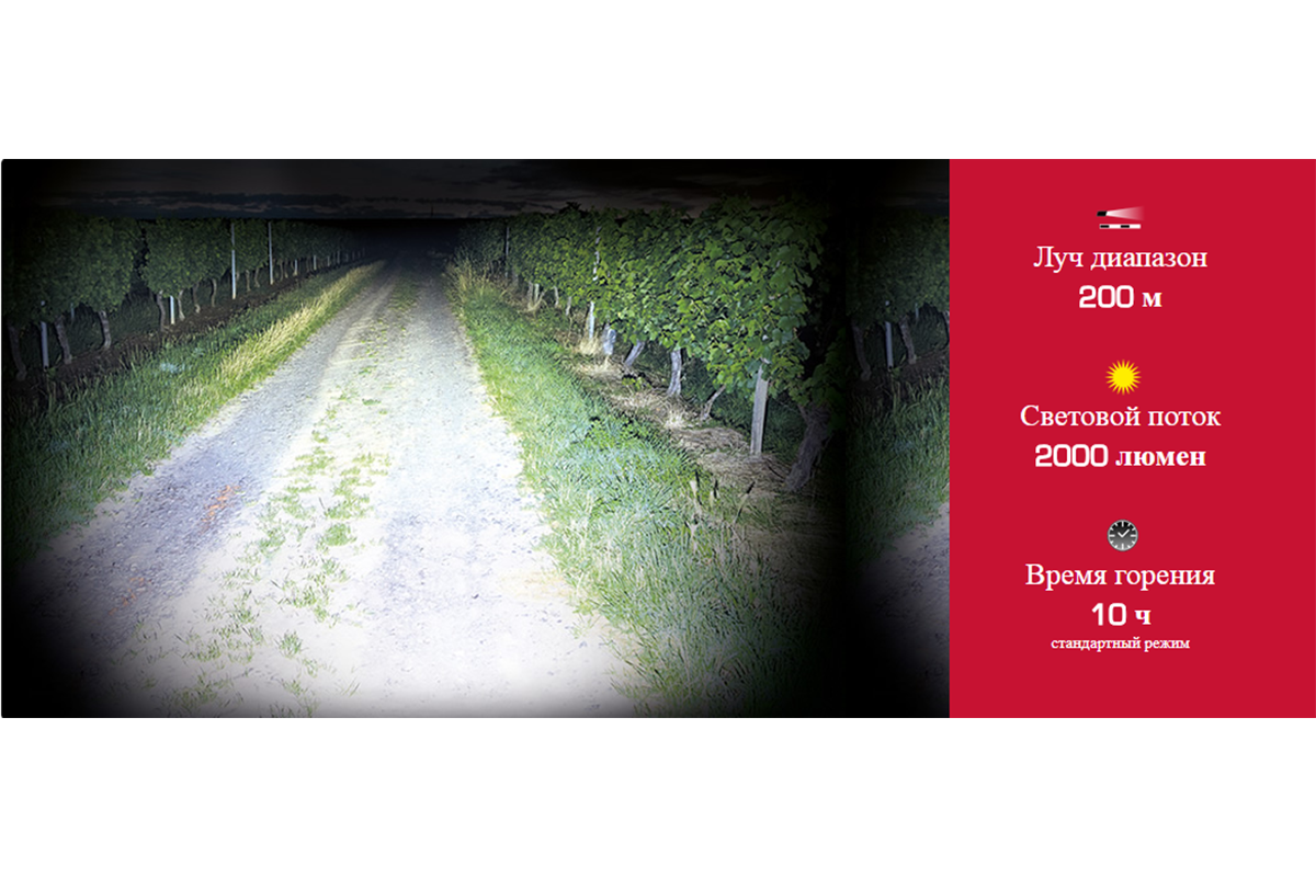 Время свечения: 2.5 h (высокомощный режим), 5 H (режим силы), 10 h( стандартный режим), 20 H (режим eco), 9 H (проблескивать), 11 h (пульсировать), 10 h (SOS-проблескивать)